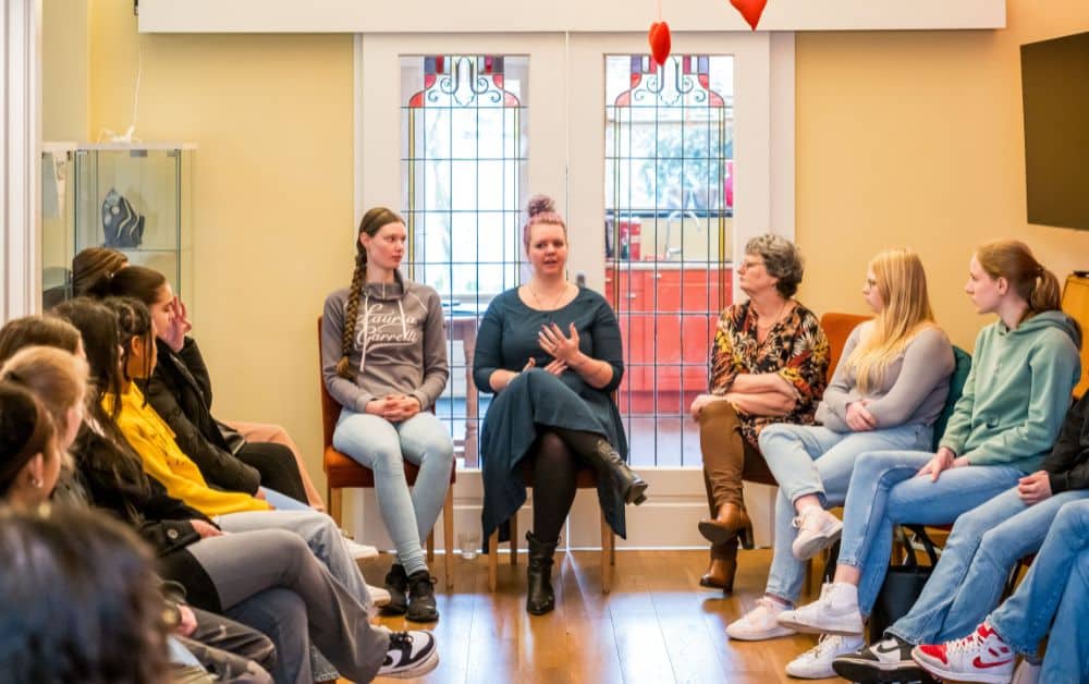 Wij ontvangen groepen van maximaal 20 leerlingen per keer, de bijeenkomst duurt een uur. We vragen een kleine vergoeding: €50,00 per bijeenkomst. We sluiten het liefst aan bij een thema uit het curriculum van de betreffende school. Sommige scholen hebben een themaweek over bijvoorbeeld gezondheid, zelfbeeld, of pesten, of is er een lessencyclus binnen een vak waar zo’n bezoek bij aan zou kunnen sluiten. Ook binnen het mentoraat zou een bezoek aan ’t Praethuys een verdieping kunnen betekenen. We hebben geen vaste opzet voor de bijeenkomst. Toespitsing, planning, aantal groepen: dat gaat allemaal in overleg met de school. Het is iets kleinschaligs. Van de scholen waar we nu contact mee hebben, ontvangen we twee à drie groepen per jaar. Zo kleinschalig willen we het ook houden, maar liefst wel met meerdere scholen.